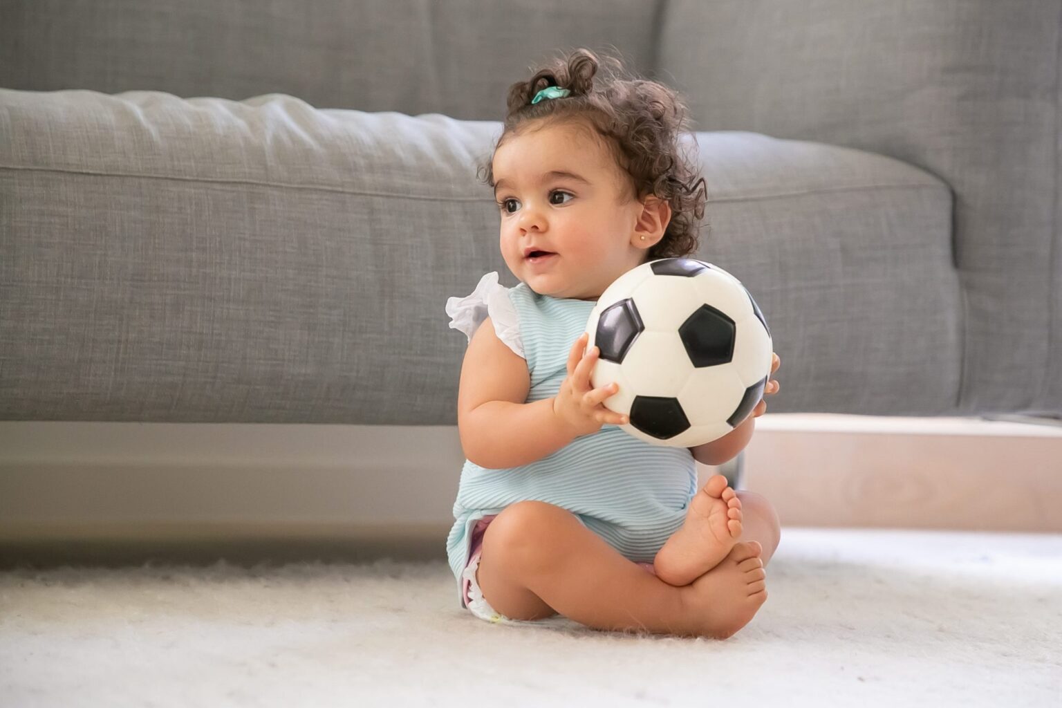 Positive black haired baby girl in pale blue clothes sitting on floor at home, looking away, playing soccer ball. Copy space. Kid at home and childhood concept