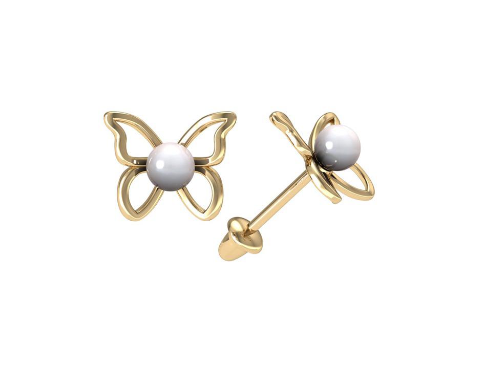 Brinco ouro amarelo 18k modelo borboleta com pérola de 3mm com acabamento todo feito à mão. As joias S. Stein Baby são lindas, seguras e confortáveis  e possuem Garantia Permanente S. Stein Joalheiros.