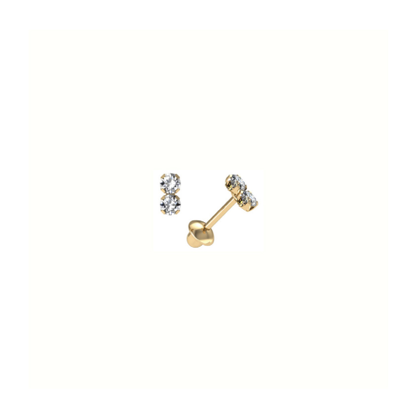 Brinco em ouro amarelo 18k modelo duplo com duas pedras de zircônias brancas de 3mm cada, com acabamento todo feito à mão. As joias S. Stein Baby são lindas, seguras e confortáveis  e possuem Garantia Permanente S. Stein Joalheiros.